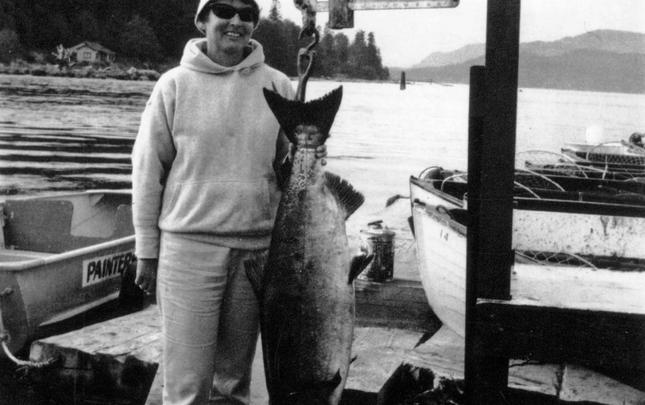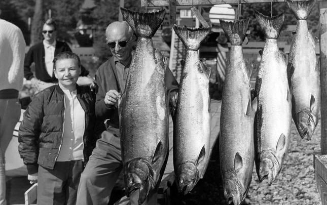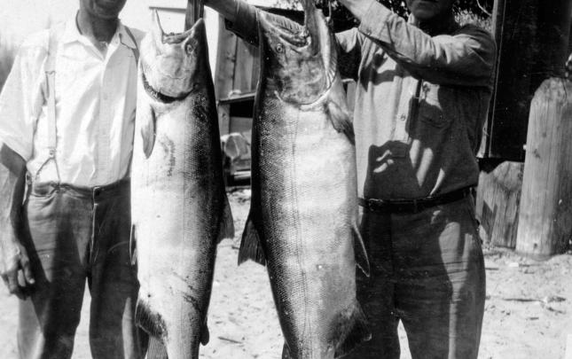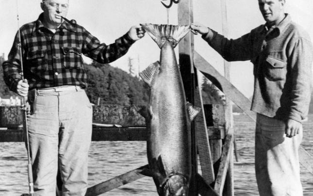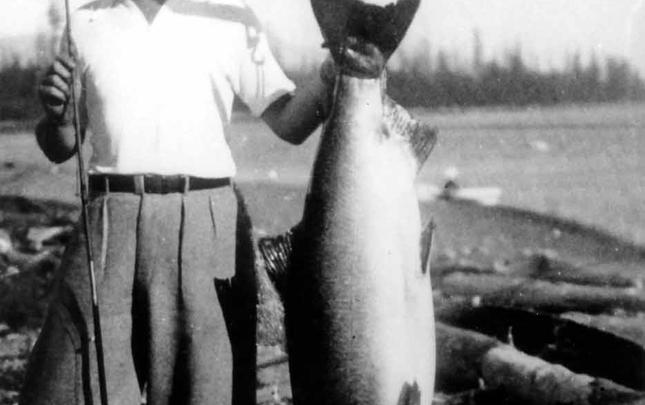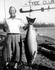 Dr. G.L. Moore of Bakersfield, California, U.S.A. with his catch of 70½ lb Tyee, which was disqualified as the rod was ½ inch too short. September 10, 1949. Guide Peter Sieven-Piper.