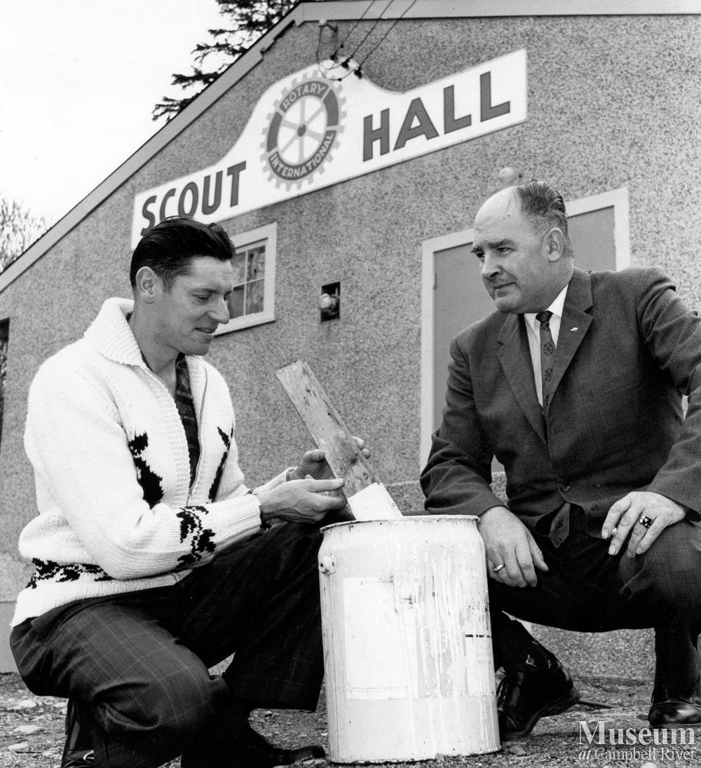 Members of the The Campbell River Rotary Club in front of Scout Hall. Incoming Rotary President Ken Antonelli and Rotary President Sherman Evans check a paint sample for the renovations to the Scout Hall. Apr. 29, 1964