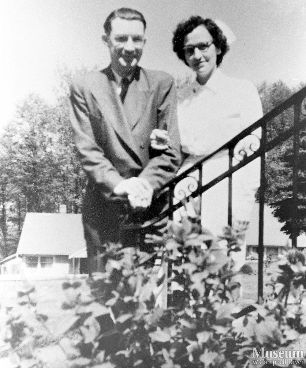 Mrs. Morin and Dr. Hall stand on the steps of the Lourdes Hospital, Campbell River.