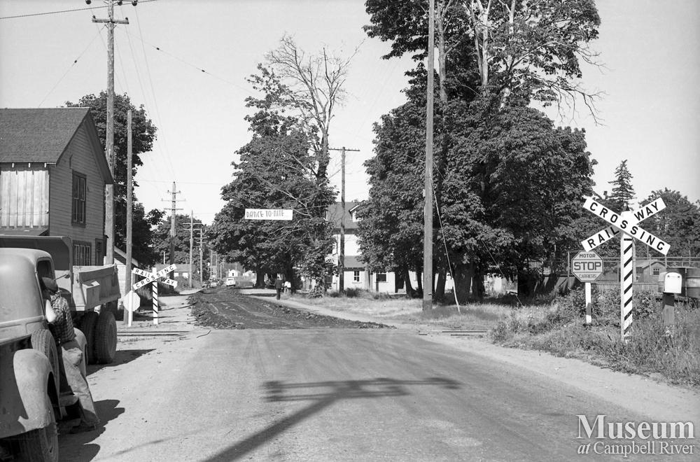 Looking north down the Island Hwy. with the Elk River Timber crossing in the foreground. First building on the right is the Quinsam Hotel.