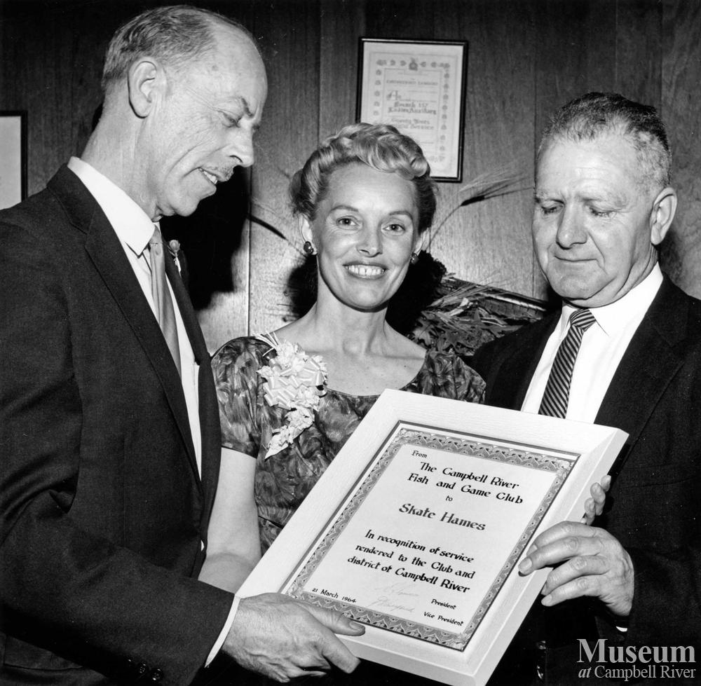 The Campbell River Fish and Game Club honoured Skate Hames for his service to the club with a plaque, which was presented to him by Dick Colby, the Director of the BC Government Travel Bureau. Mrs. L.G. Van Egan ( Maxine Egan) is also in the picture. Mar. 25, 1964