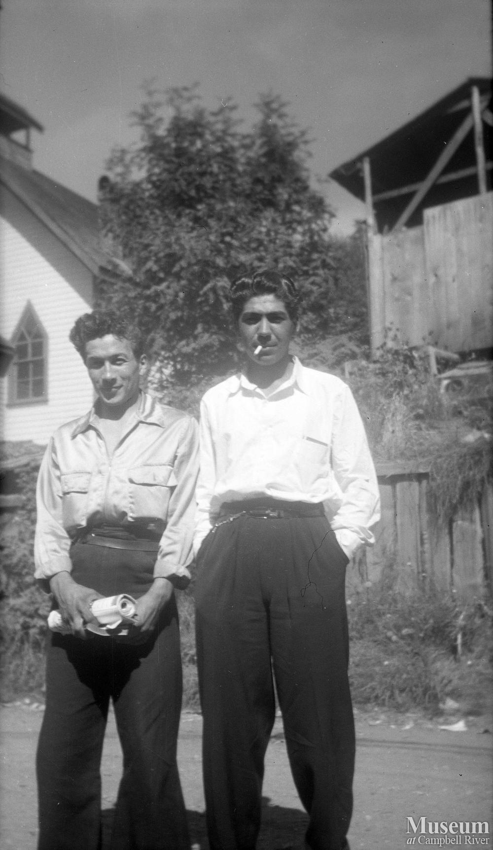 Unidentified man and George Prevost in front of the United Church in Alert Bay.