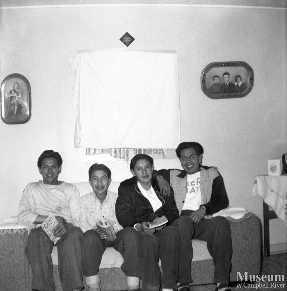 Left to right: Bill Glendale, Henry George ‘Wee sah dzee’, Peter Mountain, and Lawrence Joseph in the front room of the Henderson family home.