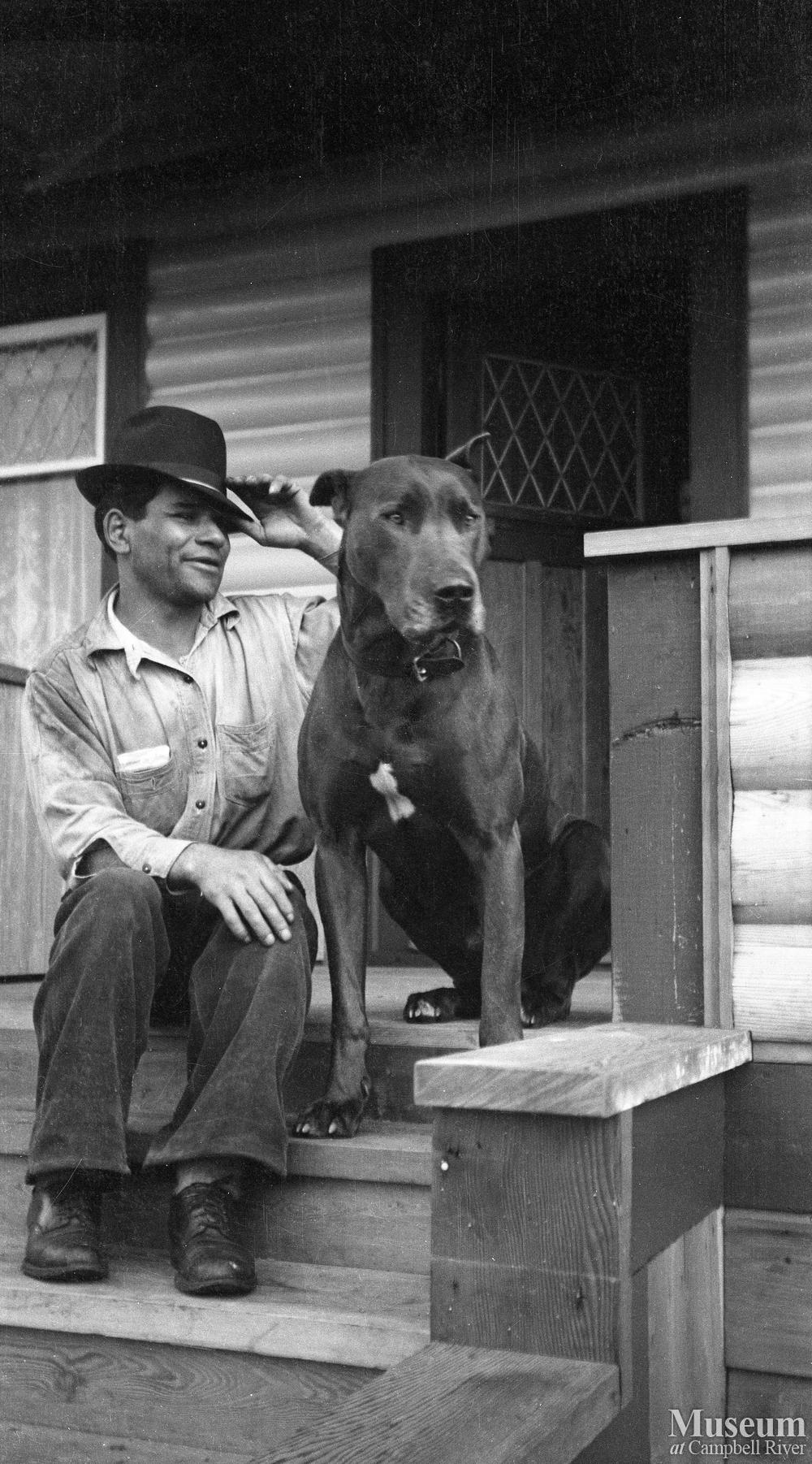 Jim Quatell (?) surveys the neighbourhood from the porch while his dog keeps a close eye on the photographer.