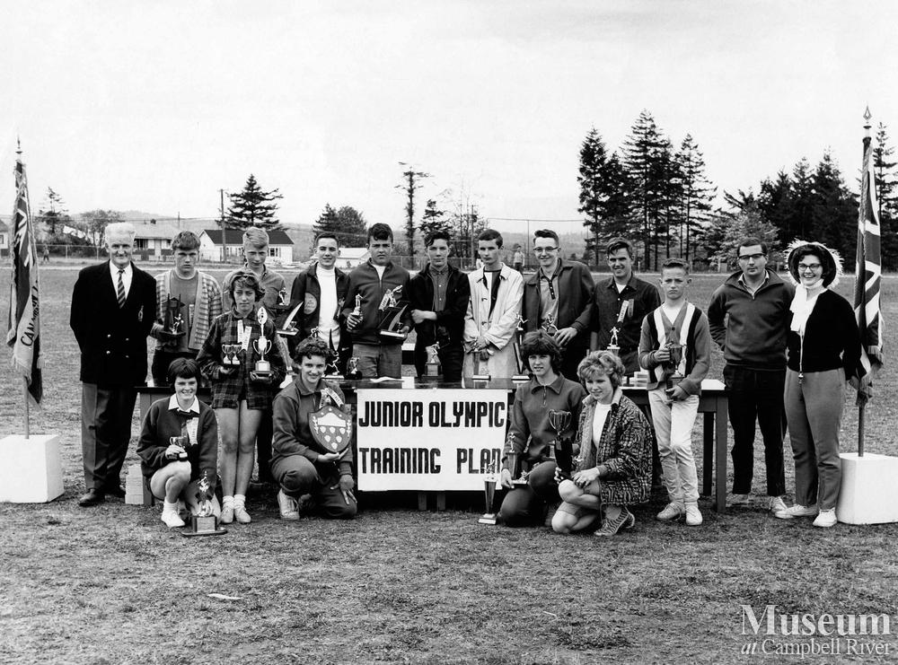 Royal Canadian Legion (Branch 137) members, sponsors of the program, meet with Campbell River's best young athletes. Back row (left to right): Legion President Ed Hay, Chris Idiens, Peter Mason, Leland Luckhurst, Eddie Waugh, Alfred Worthington, Angus Ellis, John O'Brien, Danny Telosky, and Don AND Jane Hunt, who organized the meet. Front row (left to right): Patsy Linton, Grace Clark, ??? (person with plaque is unidentified), Wendy Grant, Sharon Milmore, and Jimmy Howard. May 20, 1964
