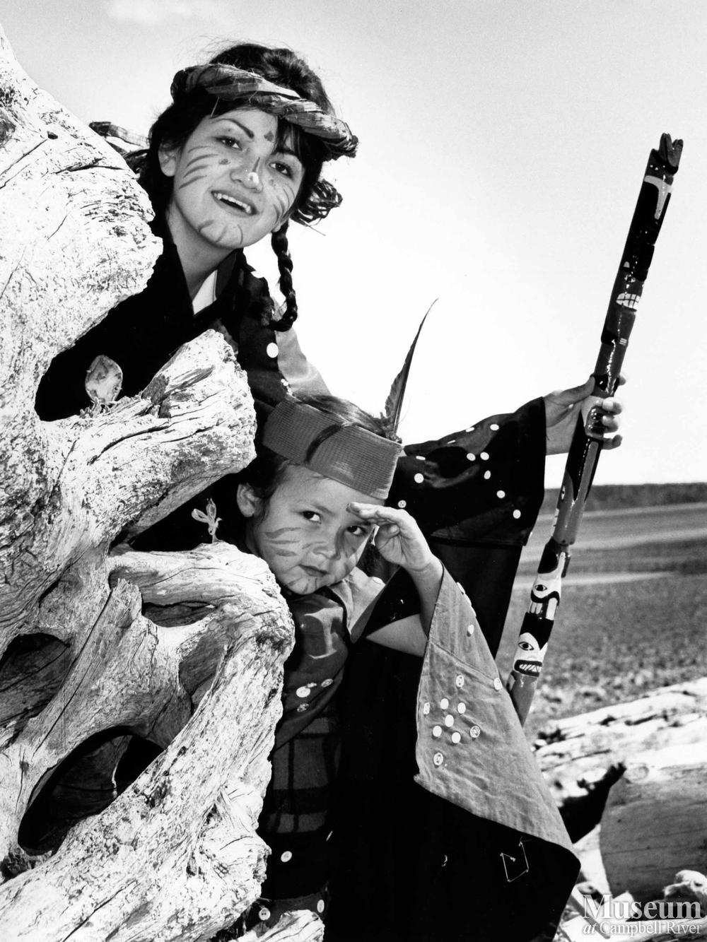 Katie (older) and Lavern (younger) Henderson, two of the daughters of Mr.andMrs. Sam Henderson, pose full First Nations dress for the newpaper photographer. Apr. 29, 1964