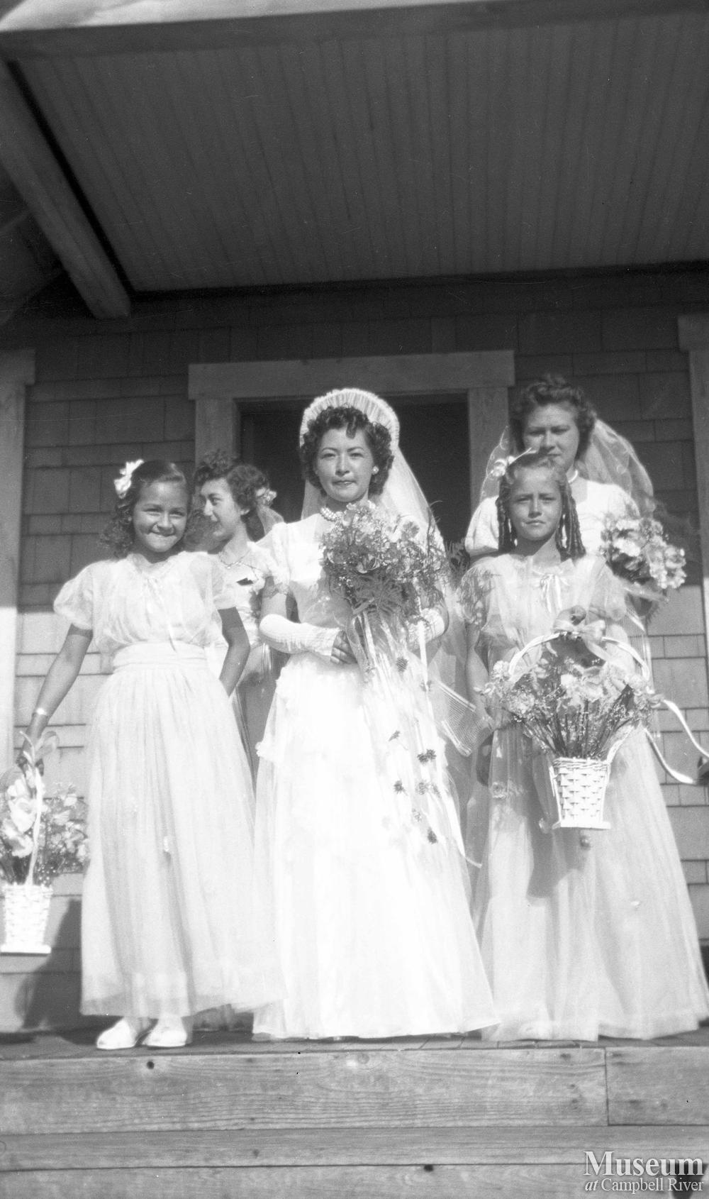 16-year-old bride Catherine Glendale poses with her wedding party on the steps of Mabel Stanley’s house in Cape Mudge village. Theirs was an arranged marriage, as Lekwiltok marriages traditionally were, and the couple exchanged vows in the Cape Mudge United Church. Flower girls were Mary Henderson and Reubina Ferry. Bridesmaids were Katie Naknakin and an as yet unidentified young woman.