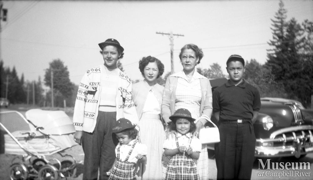 Everything about this photo says 1950’s – the matching outfits worn by the two young girls, the embroidered name hats and (most telling of all) the young woman dressed in pants. Of the more than 400 photographs in this collection (most with women in them), only 4 show women wearing pants. The people in this photograph are all children or grandchildren of Katie Henderson/Glendale/Ferry. Back row left to right: Reubina Ferry, Catherine (Cat) Naknakin, Katie Ferry, and John Ferry Jr. Front row: Cathy (Cookie) and Mercy Naknakin. Cookie still lives in Campbell River (2011).