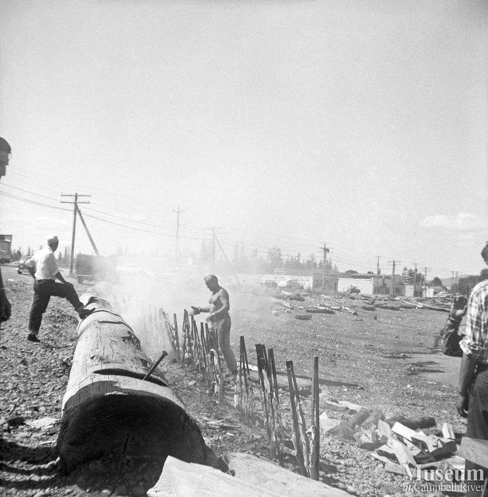 Salmon barbecue on the beach in front of the VanIsle Theatre (now the Tidemark Theatre).