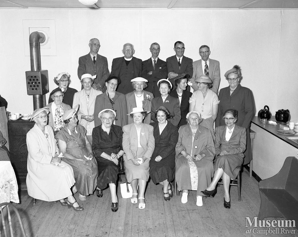 Bottom row: Mrs. Pidcock, Mrs. J. Fitzgerald, Mrs. J. Forbes, Mrs. H. Haye, Mrs. J. Edgett (of Courtenay), Mrs. D. Vanstone, and Mrs. Dave Gillan."