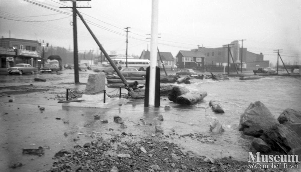 The Van Isle Theatre during a southeastern in Campbell River during the 1950s, where logs were blown across the highway.