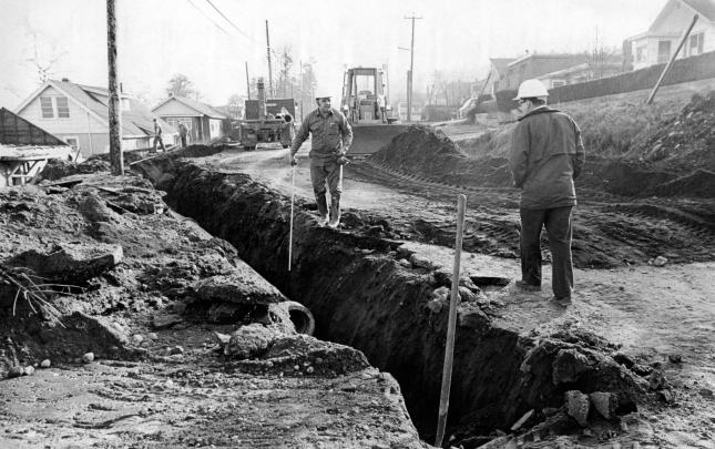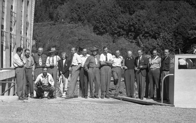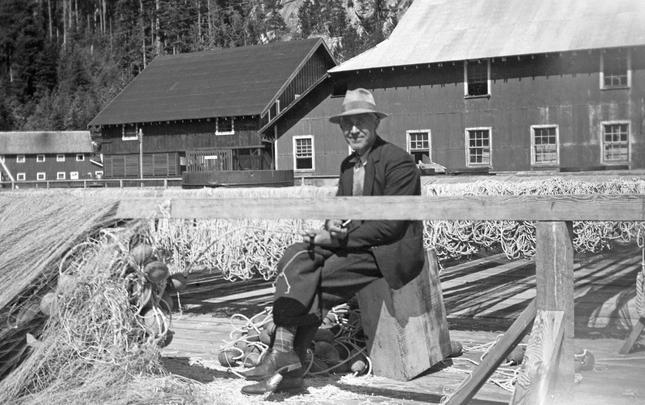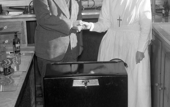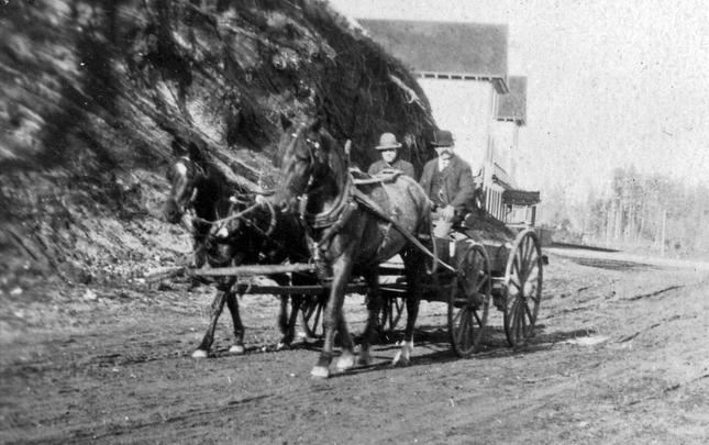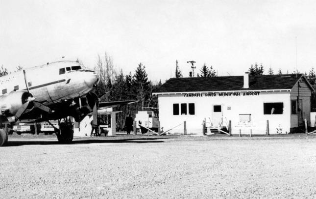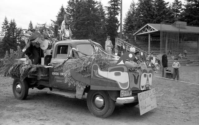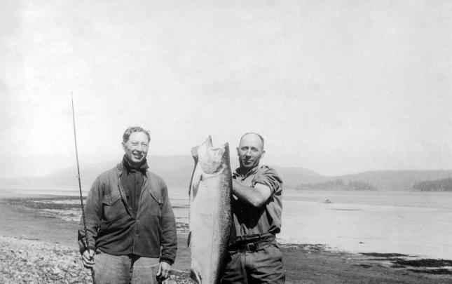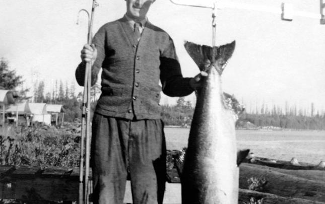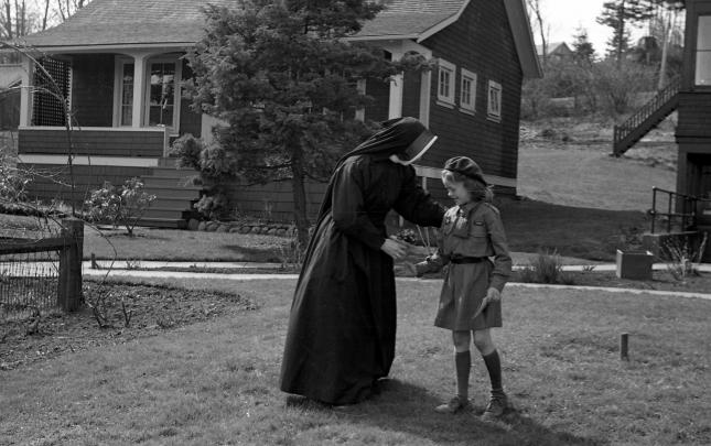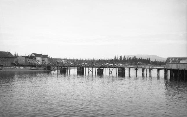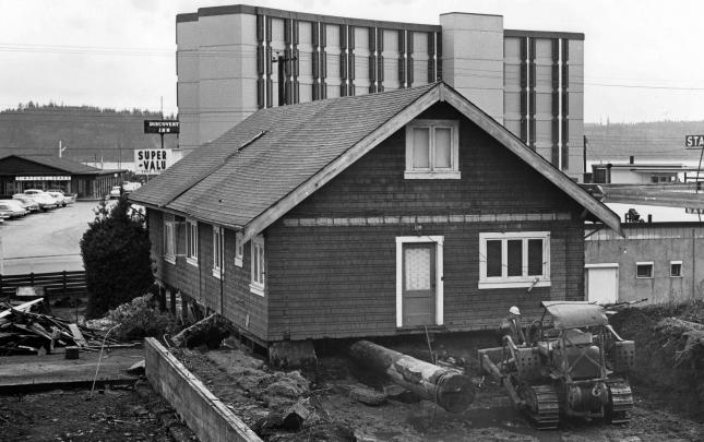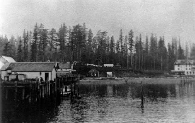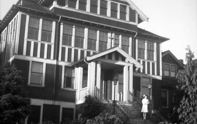 The original Lourdes Hospital at Campbell River, BC, built in 1914. Another portion was built on in 1929, and later used as the village offices before being demolished in 1960. The house at the right side of photograph was an old nurse's home, and the building just glimpsed over the trees may...