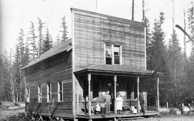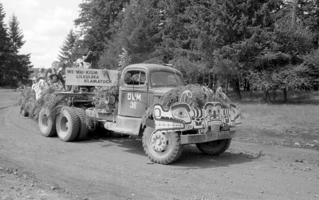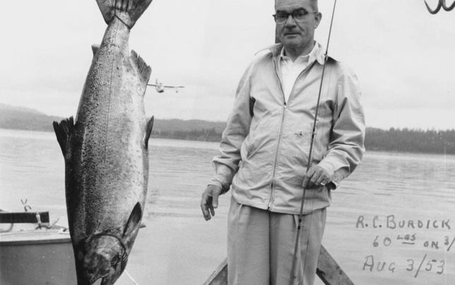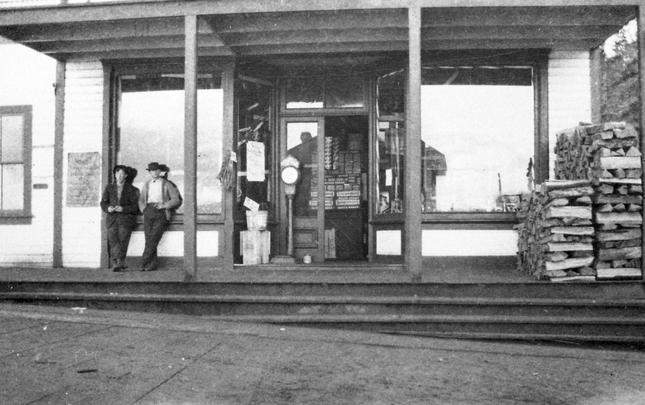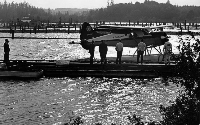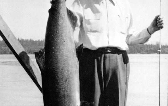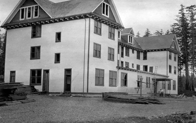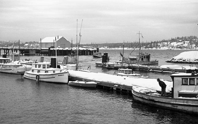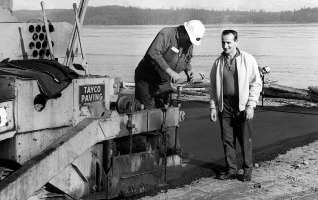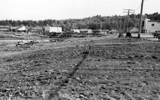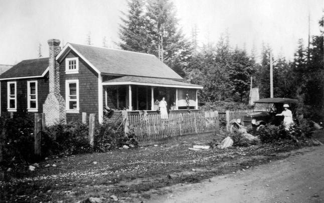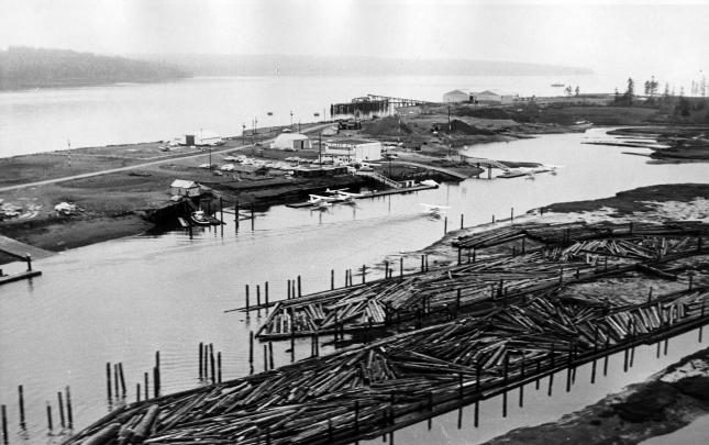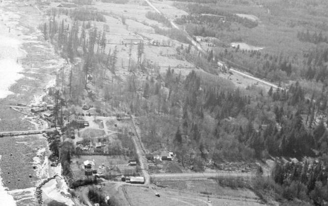 Seen in this photograph: McDonald Road in the foreground, on beach in front is the Tyee Camp - originally built by Vanstone Sr. - boat shed at the curve in the road, McDonald house on the beach above McDonald Road, above which is Painter's Lodge with wharf, and Ed Painter's old boat...