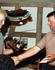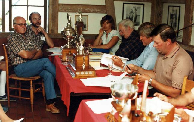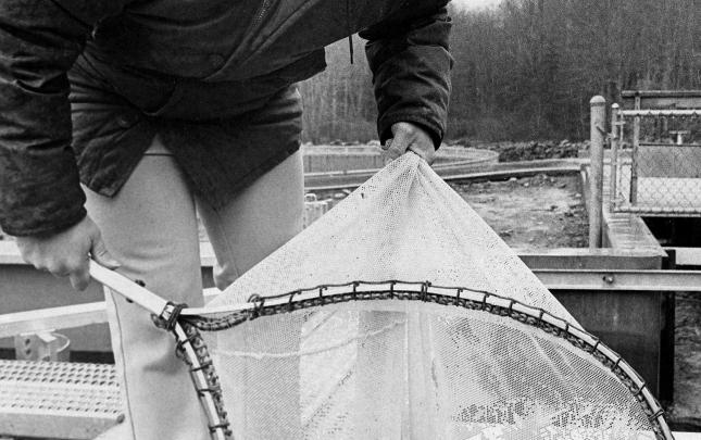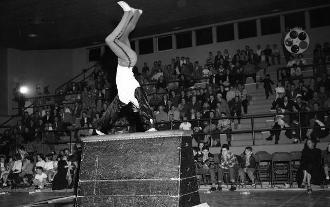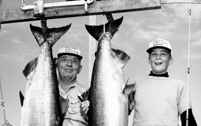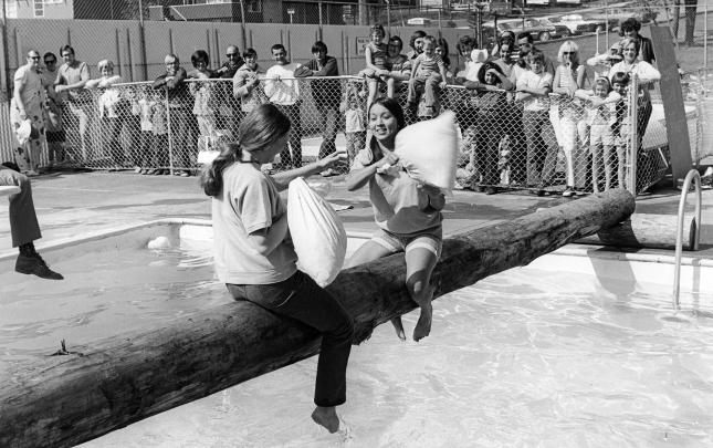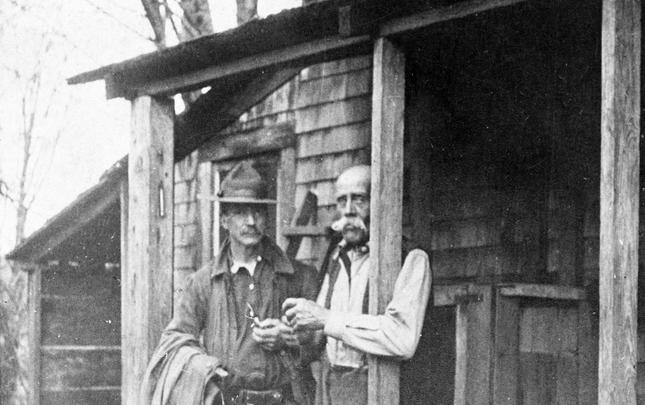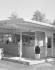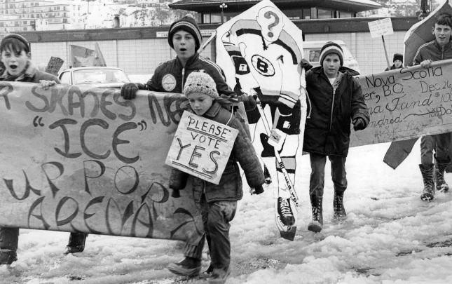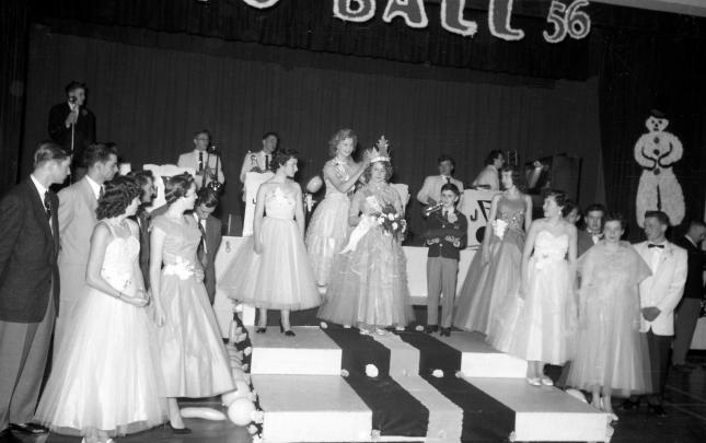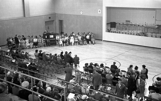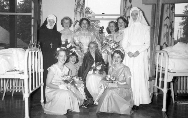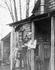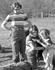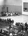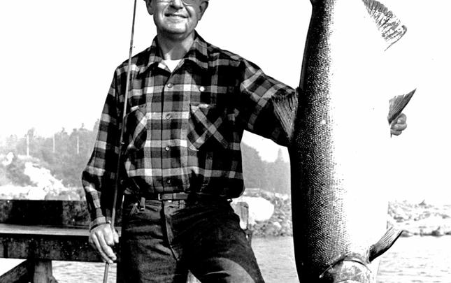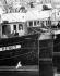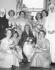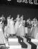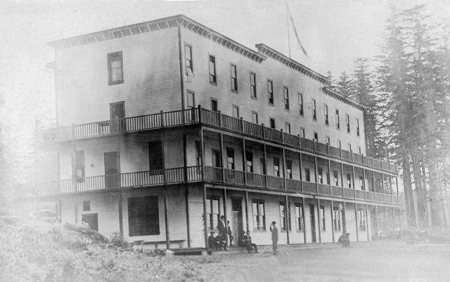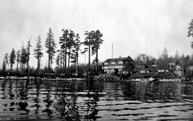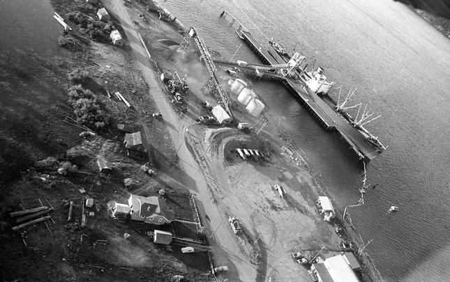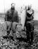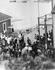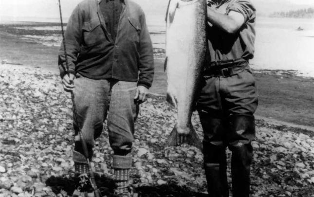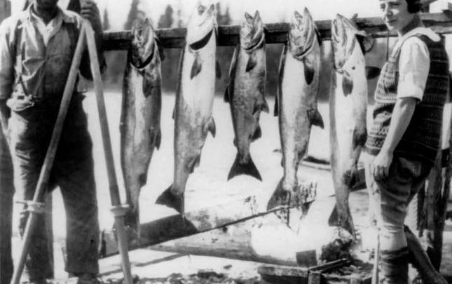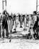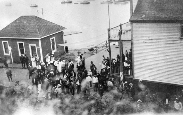 Left to right: George Quocksister, Elizabeth Quocksister, Sam Henderson, Willie Hunt, Arthur Dick, Doug Cranmer, unknown, Jack Peters, unknown, Tommy Hunt, Jimmy Dick, Jimmy King, Bill Cranmer, and John Charlie. Raising a memorial pole for Sam's wife, Mary Henderson.