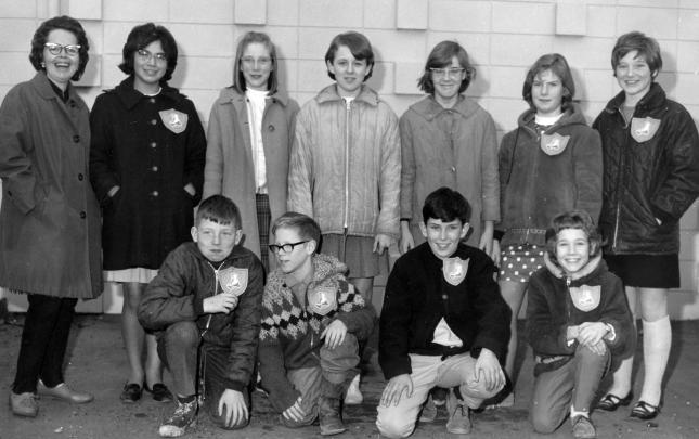 Back row (left to right): Frances Heavenor, Mary Ann Brotchie, Maureen Penman, Nancy Macklin, Patsi Logan, Patsy Tripple, and Betty Humphries. Front row (left to right): Steve Lewis, Mark Bergsma, Mike Heavenor, and Joanne Bergsma.