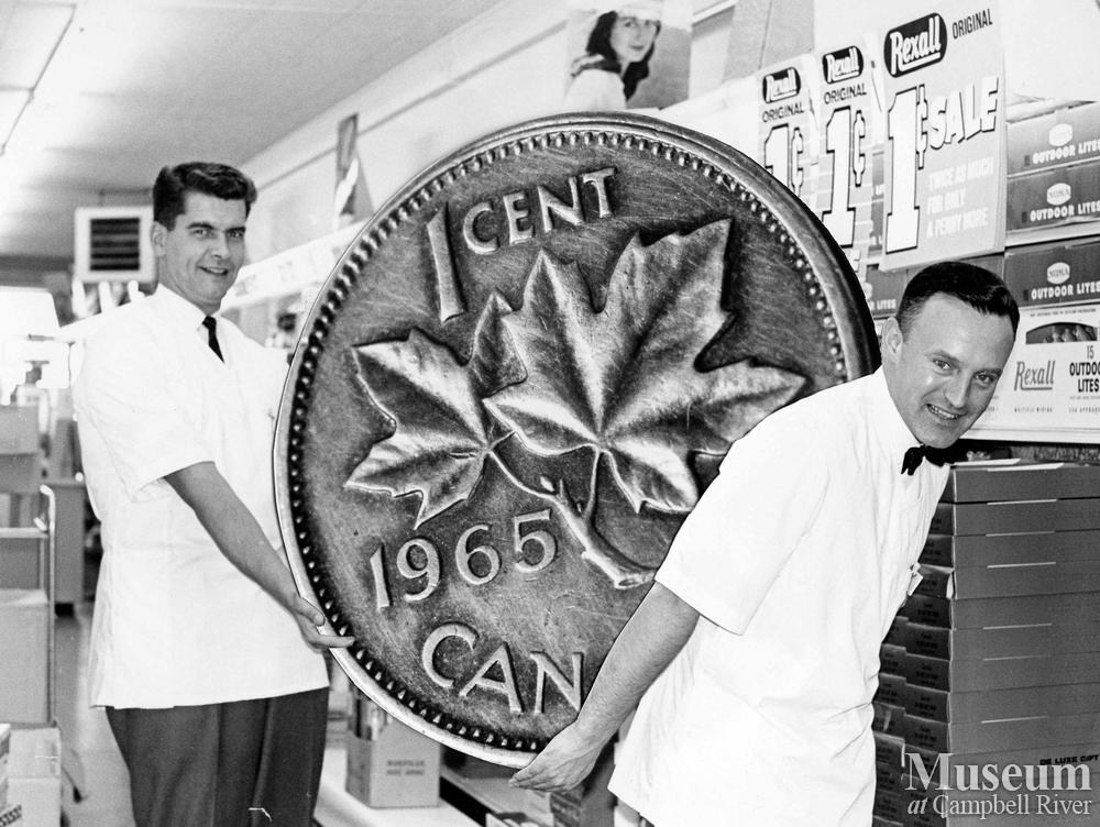 Partners Leo Richards and Clair Hamilton pose for an advertisement for Rexall Drug Stores - the giant one cent coin was added to the photograph later.
