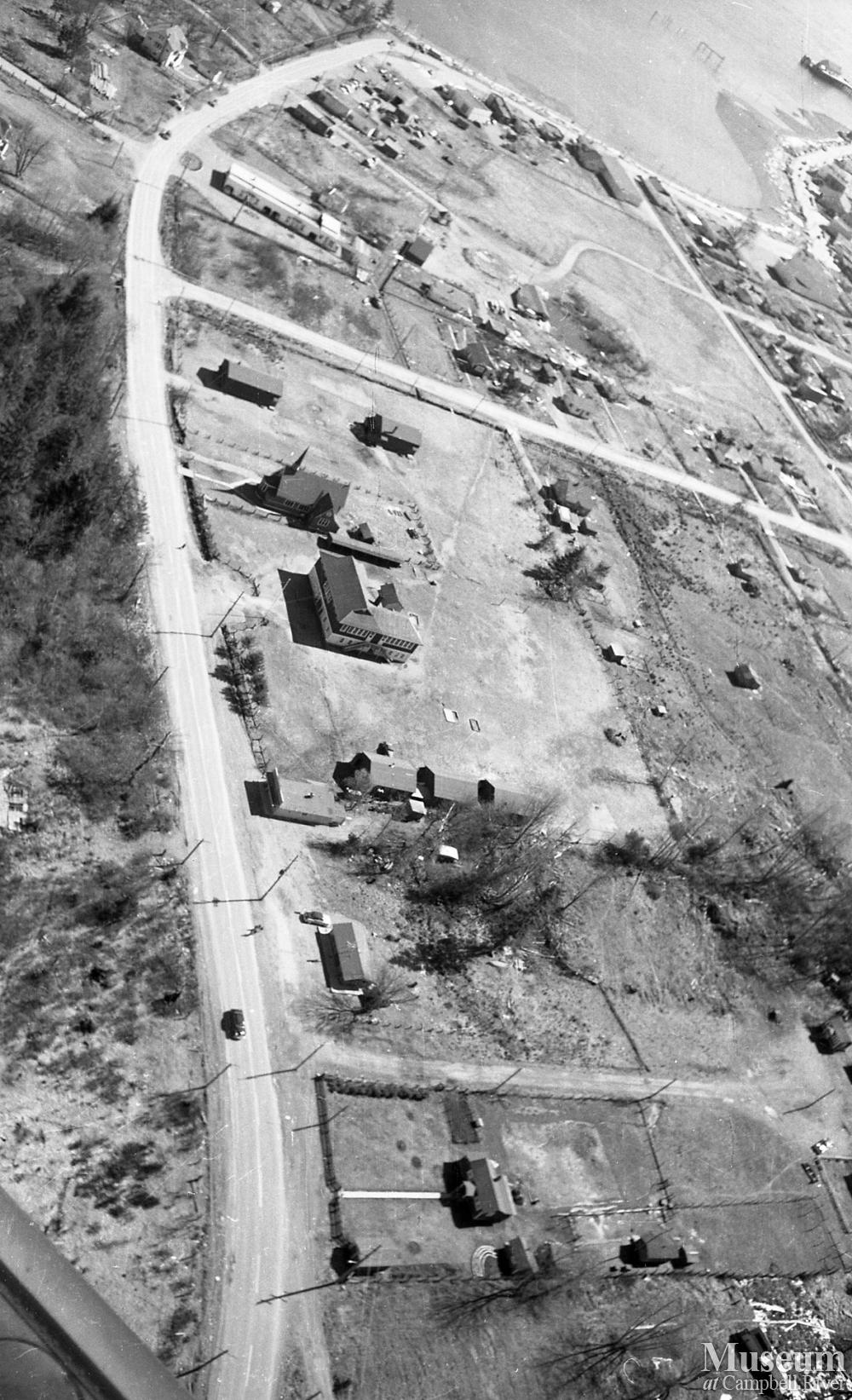 Aerial view showing the Campbell River Public School, later called the Elm School, and Anglican Church. The school burned down in 1972 and was rebuilt with the addition of offices for the school board.