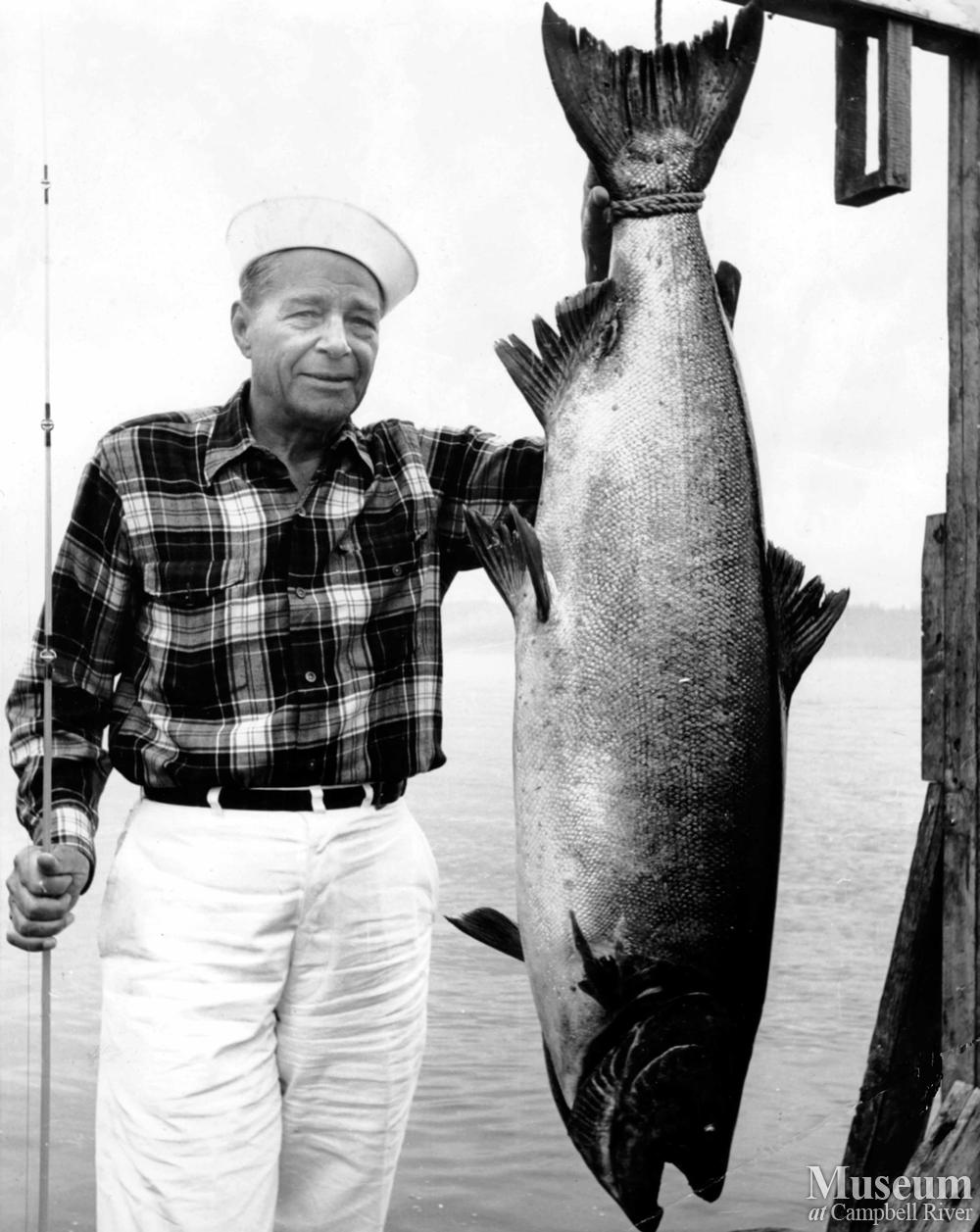 B.D. Reuther of St. Croix, Virgin Islands with his catch a 58½ lb Tyee caught on August 21, 1959. This earned him the title Tyee Man 1959. His guide (not shown in photograph) was David R. Duke.