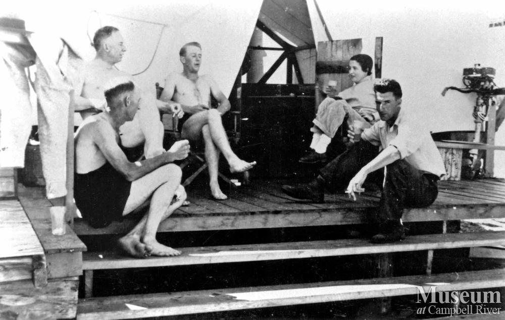 Bill Coleman's "Camp" at Tyee Spit. From Left: Herbert Pidcock (sitting on steps in black bathing suit), Bill Coleman, Heber Smith, Julie Dodge Nelson, and Darrell Smith. Herbert, Heber, and Darrell were sportfishing guides for Painter's.
