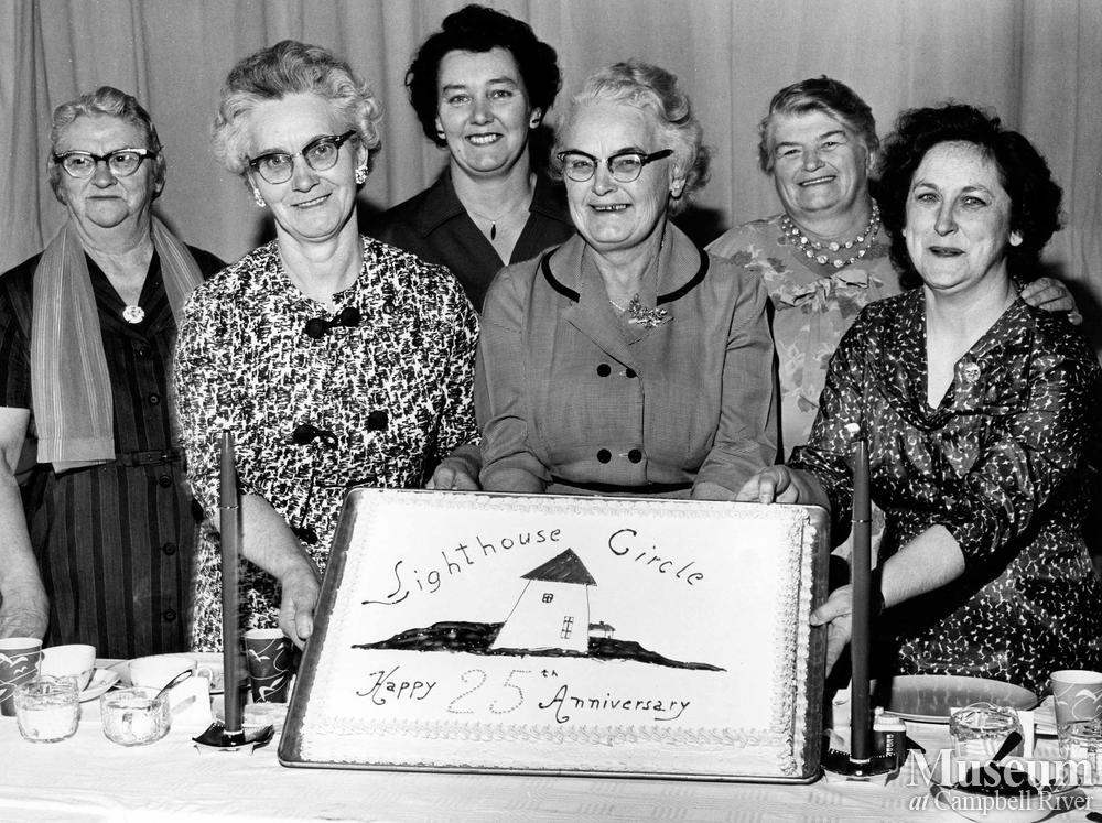 The Lighthouse Circle 25th Anniversary Left to right: The first President of the circle, Mrs. H.W. Allen; the 1964 Vice-President, Mrs. B. Arnason; Mrs. E. Christenson; the 1964 President, Mrs. A. Wiggins; a past President, Mrs. K.M. Anderson; and the secretary, Mrs. L. Mancrief. Apr. 1, 1964