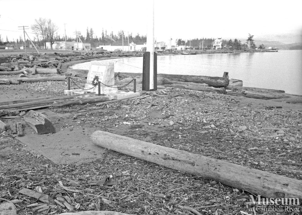 View of the original war memorial cenotaph located on the Island Highway (in forefront). This photograph was taken before the Tyee Plaza development.