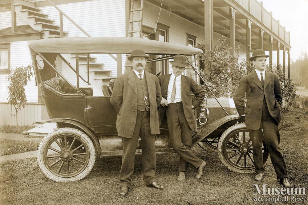 From left: Charles Thulin, Carl Thulin Sr., and Mr. McDonald with the Thulin's new car in front of the family home - Thulin Court (later known as Richmond Court).