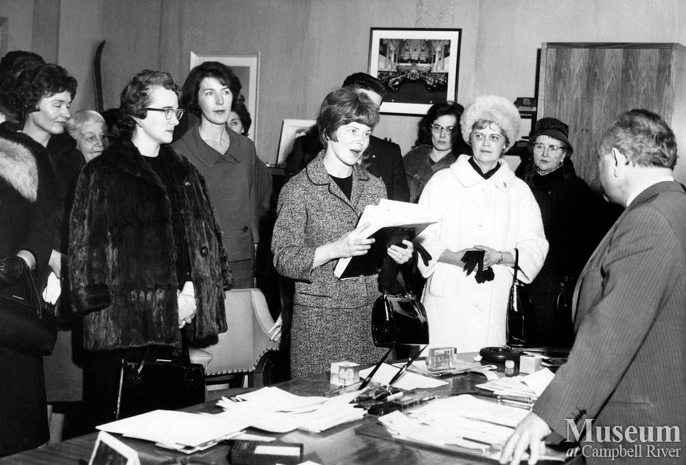 Mrs. Bill Baikie presents her case to the Highways Minister, P.A. Gaglardi, backed up by the group of 37 marching mothers from Campbell River. The concerned mothers asked the Minister to consider a bypass highway for Campbell River, considering the highway speed limits on the waterfront to be too dangerous for a residential area. Mrs. Baikie (centre) is flanked by Mrs. L. Bundy (left), and Mrs. H. McGregor (Morgan Ostler) and Mrs. A. Sandberg (right). Dec. 15, 1965