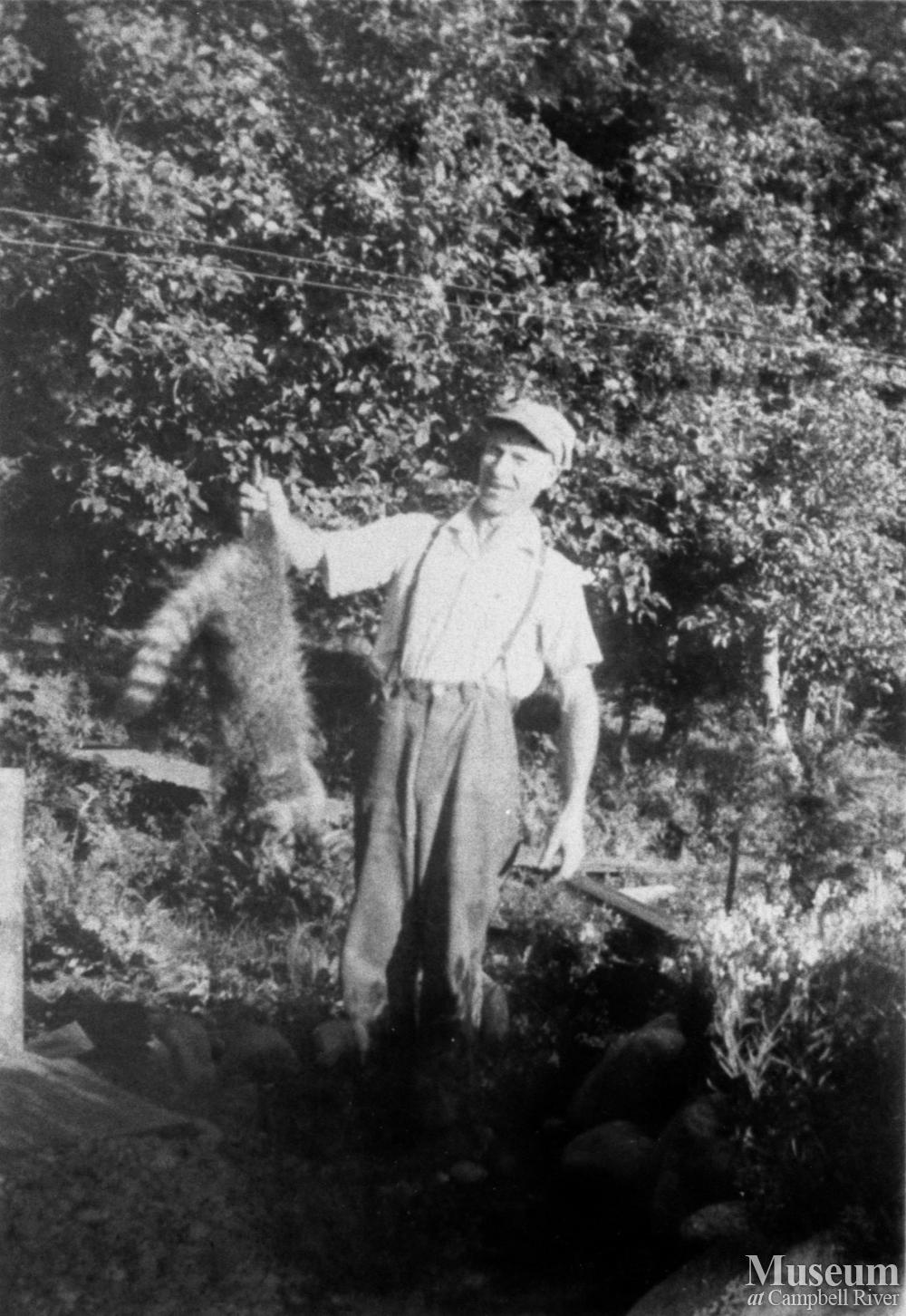 George Nunns with racoon that he trapped