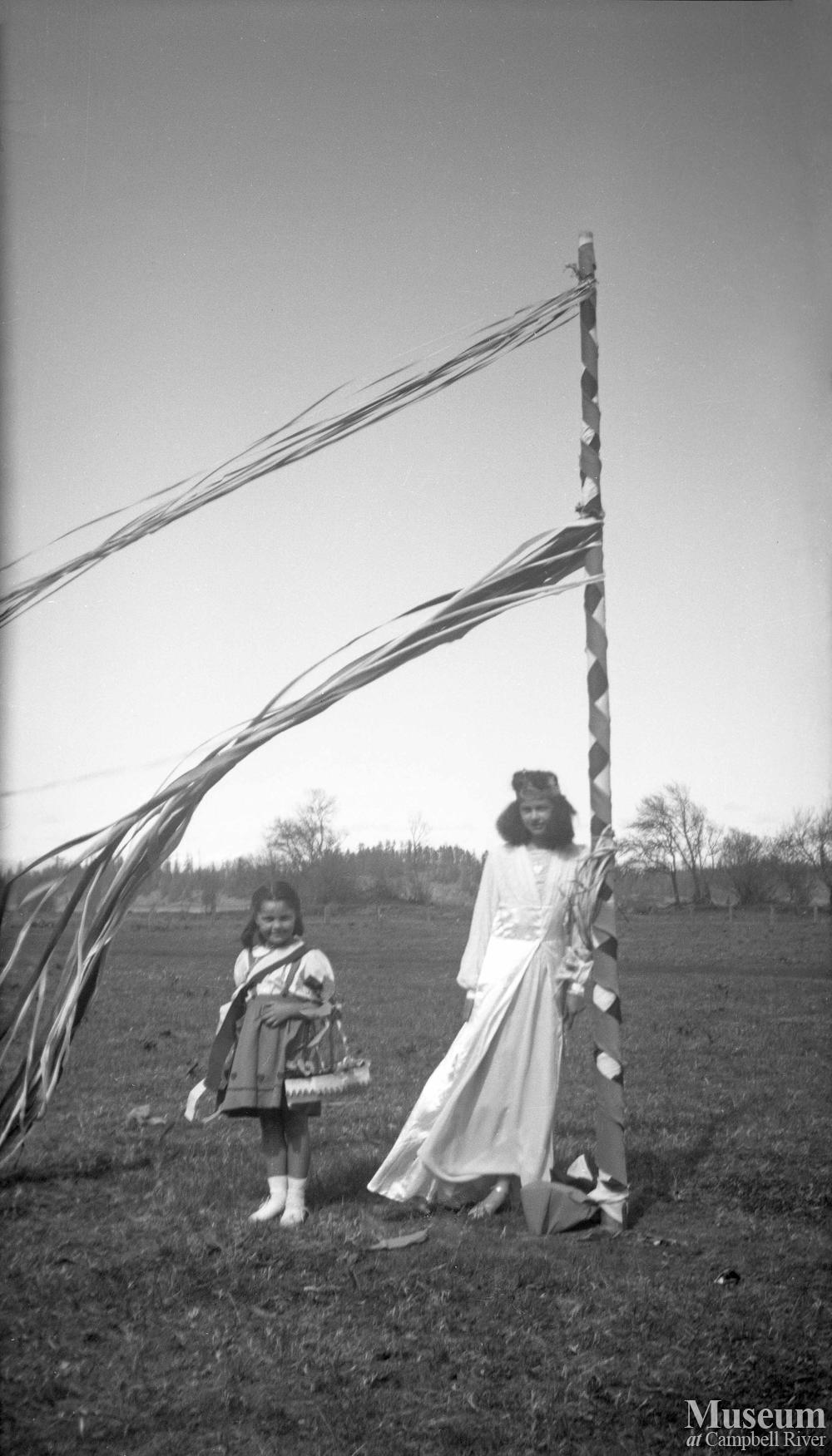 May Queen Yvonne Price, eldest daughter of Daisy (Roberts) and Tom Price, stands beside the pole. The second young girl has not been identified.