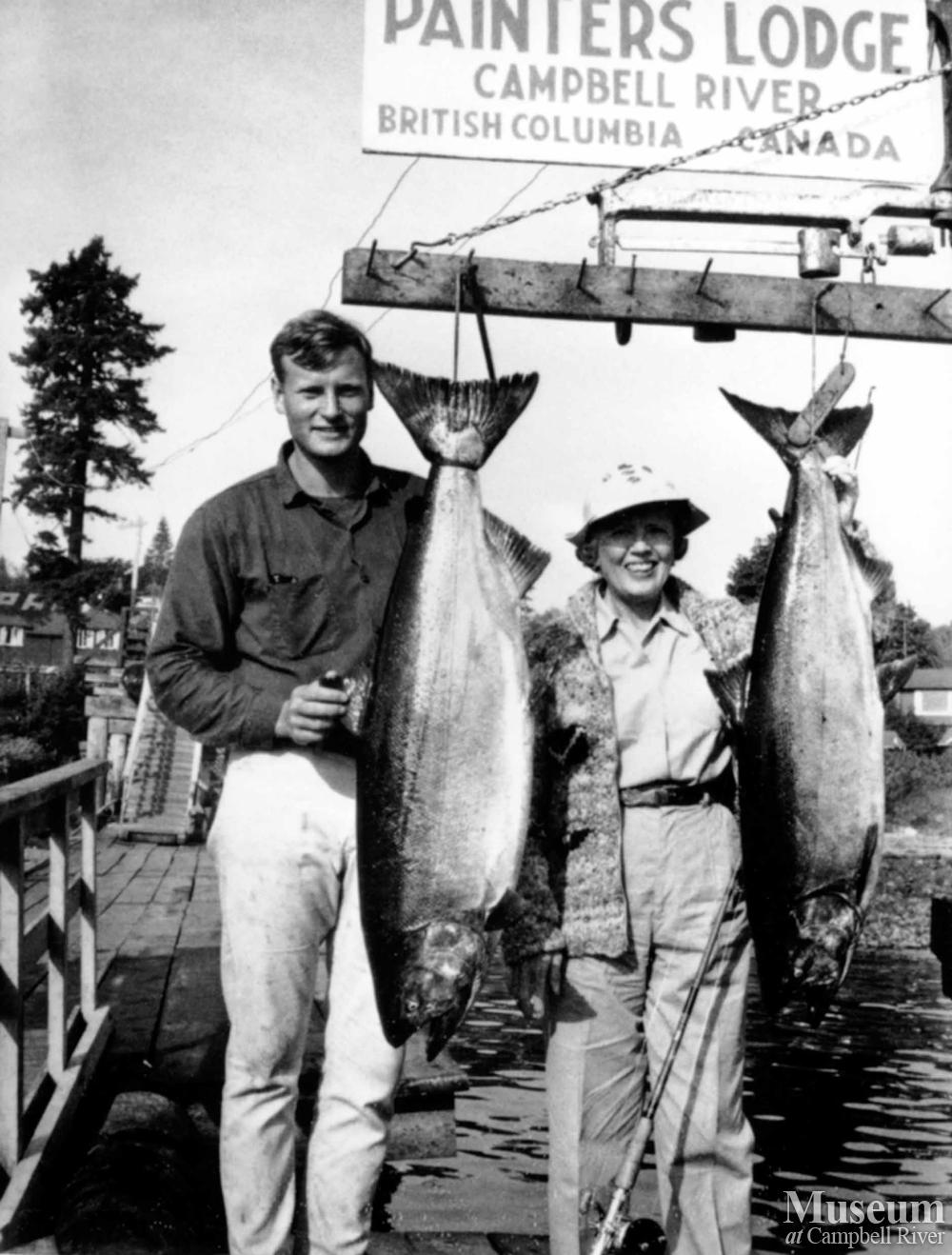 Daily Double Trophy winner for 1967, Mrs. John Ferguson with her guide Doug Piggott. Her catches, a 45½ lb and a 37 lb Tyee, which she caught on August 29, 1967.