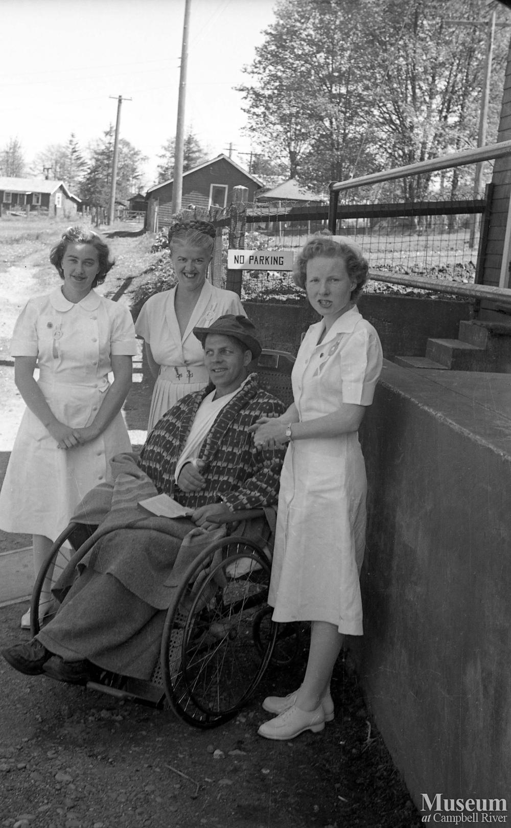 Nurses with patient outside Lourdes Hospital, Campbell River