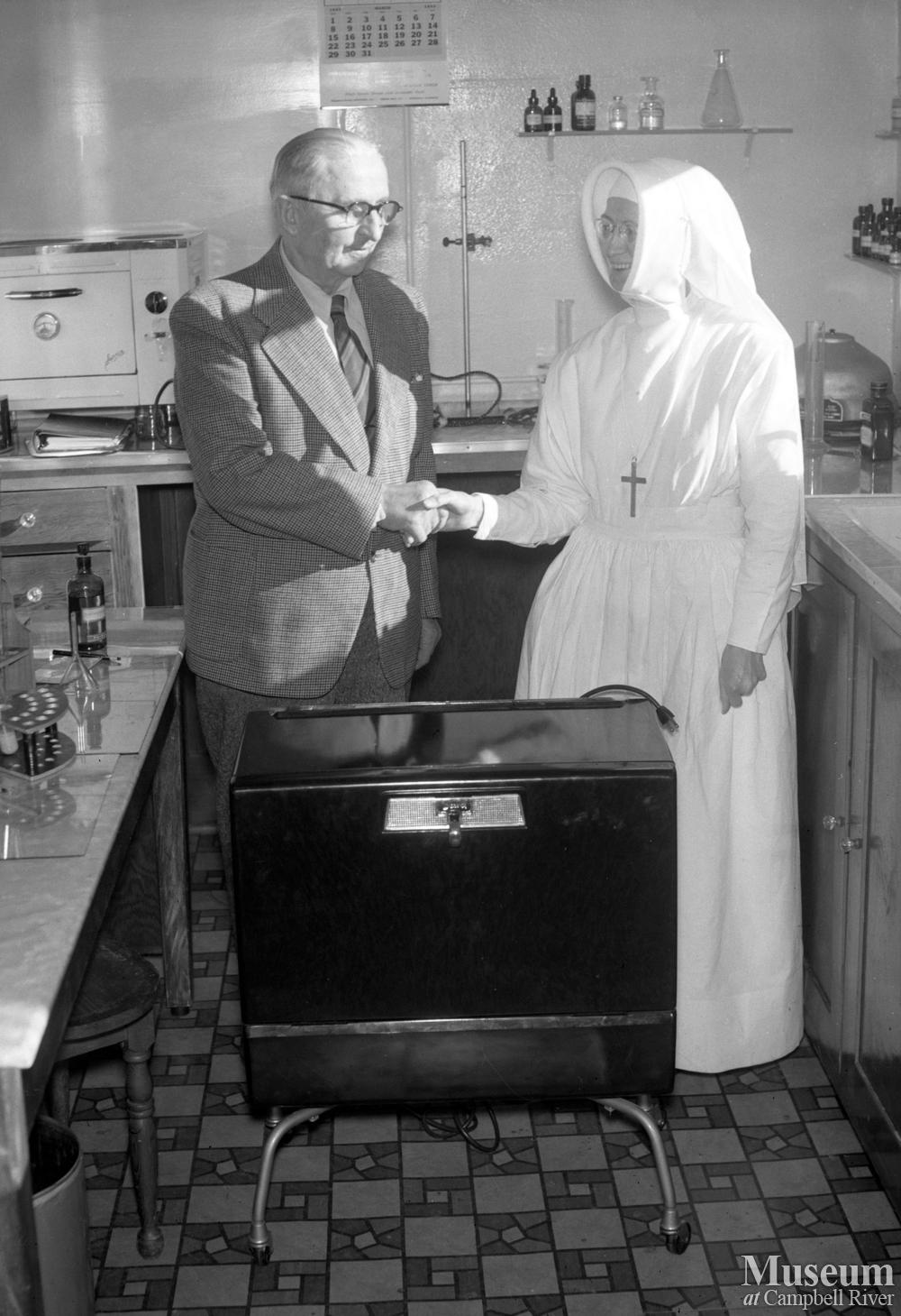 Nunns from the order of the Sister's of St. Ann's operated the Lourdes Hospital in Campbell River from 1929-1957. One of the Nunns receiving a new piece of equipment which appears to be a refrigeration unit of some type.