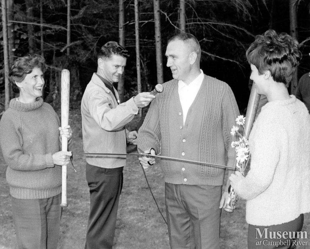 Mayor Kenneth 'Skip' McDonald cuts the ribbon at the opening ceremony for the new Willow Point ball park. The ribbon is held tied between two bats, held by Mrs. Ross Rathie (left) and Joan Walker (right). June, 1968.