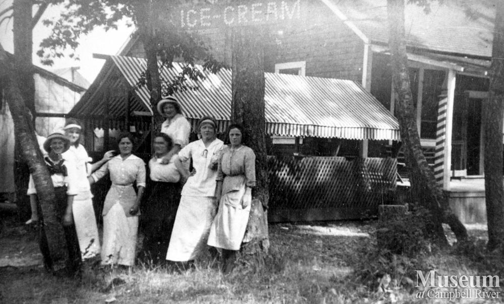 The pool room and ice cream parlour was operated by T.W. Hanson. The ladies include: Miss Miller, Miss 'Bud' Swanson (later Mrs. Dudley McGeer), Elin Thulin, Anna Thulin, and Hilma Swanson.