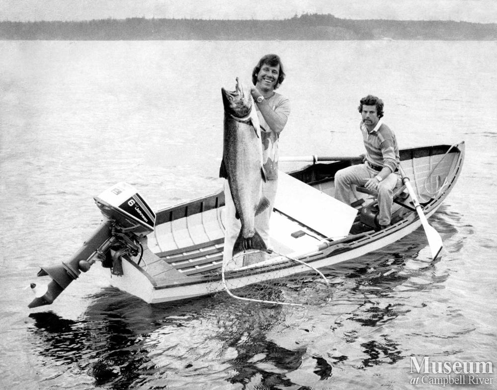 R.D. Berger (on left) holding his catch of a 43 lb Tyee which he caught on August 5, 1975. Guide Graham Nielson on right.