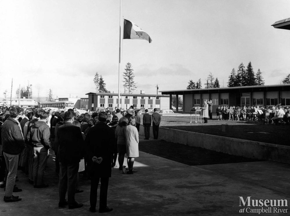 Students at Campbell River Senior Secondary honour the fallen soldiers for Remembrance Day - Principal John Young conducting service.