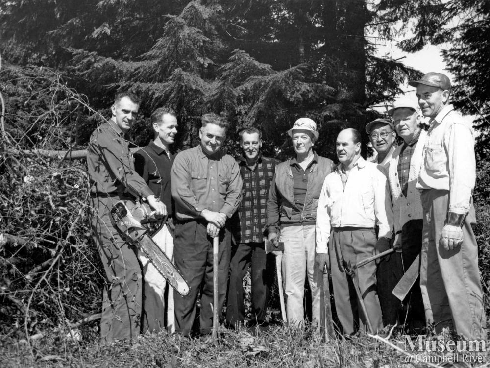 The Rotary Club built a trail on the banks of the Campbell River, from the logging bridge down towards the mouth of the river. Pictured here (from left to right): Bob Henshall, Russ Preston, Jack Baikie, Doug Robinson, Wallace Baikie, Ken Thompson, Ken Sogawa, Sven Rudman (?), and Len Rossiter.