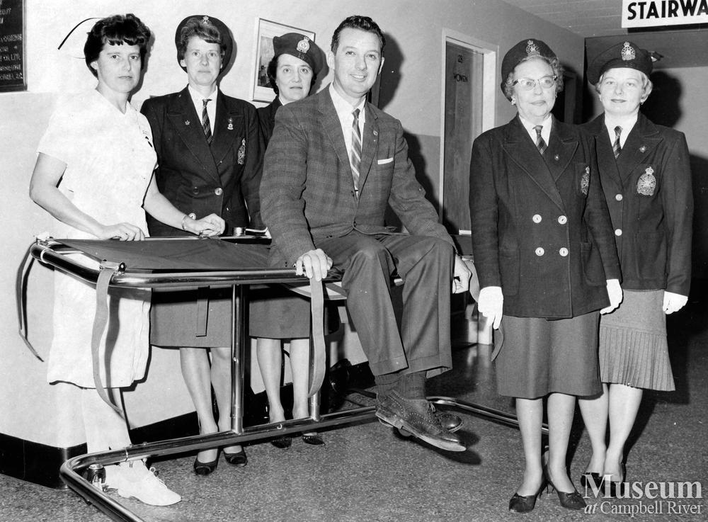 Campbell River and District General Hospital Administrator Art Lightfoot sits on the stretcher donated by the Ladies Auxiliary to the Royal Canadian Legion. Left to right: Nurse Sally Kerr, Ione McDonald, Anita Worthington, Mr. Lightfoot, Alice Williamson, and Barbara Kirkpatrick.
