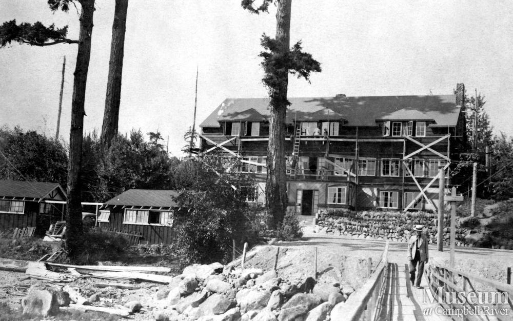 View of Painter's Lodge under construction in August 1938. Mr. Remington Bishop can be seen walking down the wharf. The Painter family initially began operating a fish camp on the Tyee Spit, Campbell River and later established Painter's Fishing Resort.